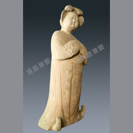 盛唐时期,1988年1月西安东郊韩森寨红旗电机厂唐墓出土,高74cm。眉目细长,两鬓自头顶左右分开垂于两侧,着窄袖襦衫,下套曳地长裙。面庞端庄圆润。披帛从左胸向上绕中间下垂于腹部,在环绕而上经左肩至背后垂地。双手放于胸前,手隐袖内,裙下露出翘头履。体态丰腴。