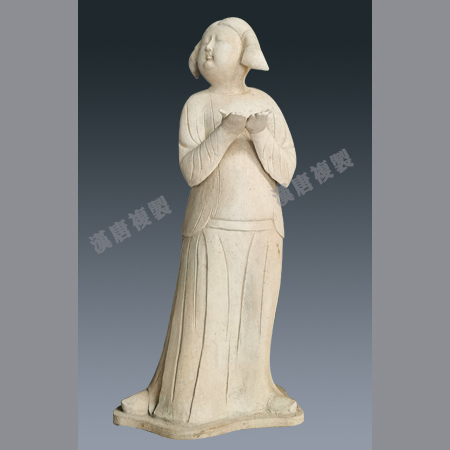 头梳双环鬓,着圆领长袍,腰束带,足蹬靴。双手捧物与胸前,直立于一底座上。此俑女着男装为一少女形象。手前伸,腰略后仰,头微上仰,面带微笑,姿态优美,也流露出一股自信高傲之气。