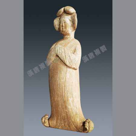 盛唐时期,1988年1月西安东郊韩森寨红旗电机厂唐墓出土,高72cm。眉目细长两鬓自头顶左右分开垂于两侧,着窄袖襦衫,下套曳地长裙。面庞端庄圆润。披帛从左胸向上绕中间下垂于腹部,在环绕而上经左肩至背后垂地。双手放于胸前,手隐袖内,裙下露出翘头履。充分展示了唐代侍女雍容华贵,仪态万千的优雅形象。